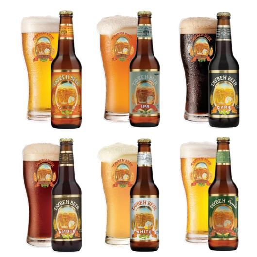 Taybeh Golden LagerTaybeh IPA., Taybeh Dark, Taybeh Amber, Taybeh White og Taybeh nonalcoholic. En unik smagsoplevelse og gaveidé fra det ældste microbryggeri i Mellemøsten.
